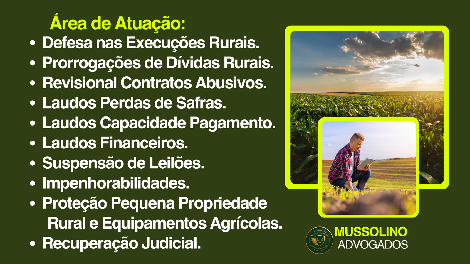 Fundada em 1999, a Mussolino Advogados, liderada pelo Dr. Marcelo de Sousa Mussolino (ceo fundador), é especializada na defesa do produtor rural, oferecendo soluções jurídicas eficazes.